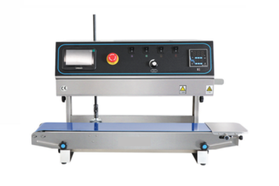 Soudeuse en continu en Inox avec convoyeur incorporé pour la fermeture des sacs à cadences soutenues, les sacs sont déposés verticalement. Cette machine peut être fournie sans son convoyeur pour intégration dans des lignes existantes.