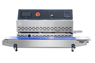 Soudeuse en continu avec convoyeur incorporé en option pour la fermeture des sacs à moyen contenance (jusqu'à 20kg) et à cadences soutenues.